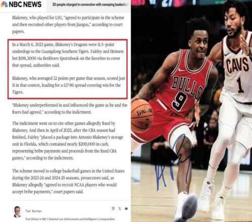 1月16日美国NBC报道,美国联邦检察官已经对被控操纵美国大学生篮球联赛和中国男子职业篮球联赛的26人提起诉讼。在26人被起诉名单中,包括了前CBA江苏队外援、2022-23赛季得分王安东尼奥-布莱克尼。